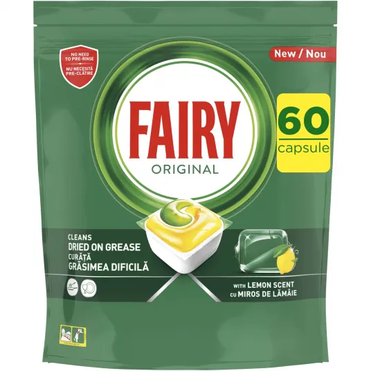 Detergent pentru masina de spalat vase Fairy All in One, 60 spalariDetergent pentru masina de spalat vase Fairy All in One, 60 spalari Instructiuni de utilizare: Beneficii: Capsulele se dizolva rapid si nu lasa urme pe vase. Indeparteaza chiar si grasimea care a stat pe vase pana la 24 de ore. Aroma de lamaie ofera masinii de spalat vase un miros fresh. Marca recomandata de producatorii de masini de spalat vase.222214334222214334