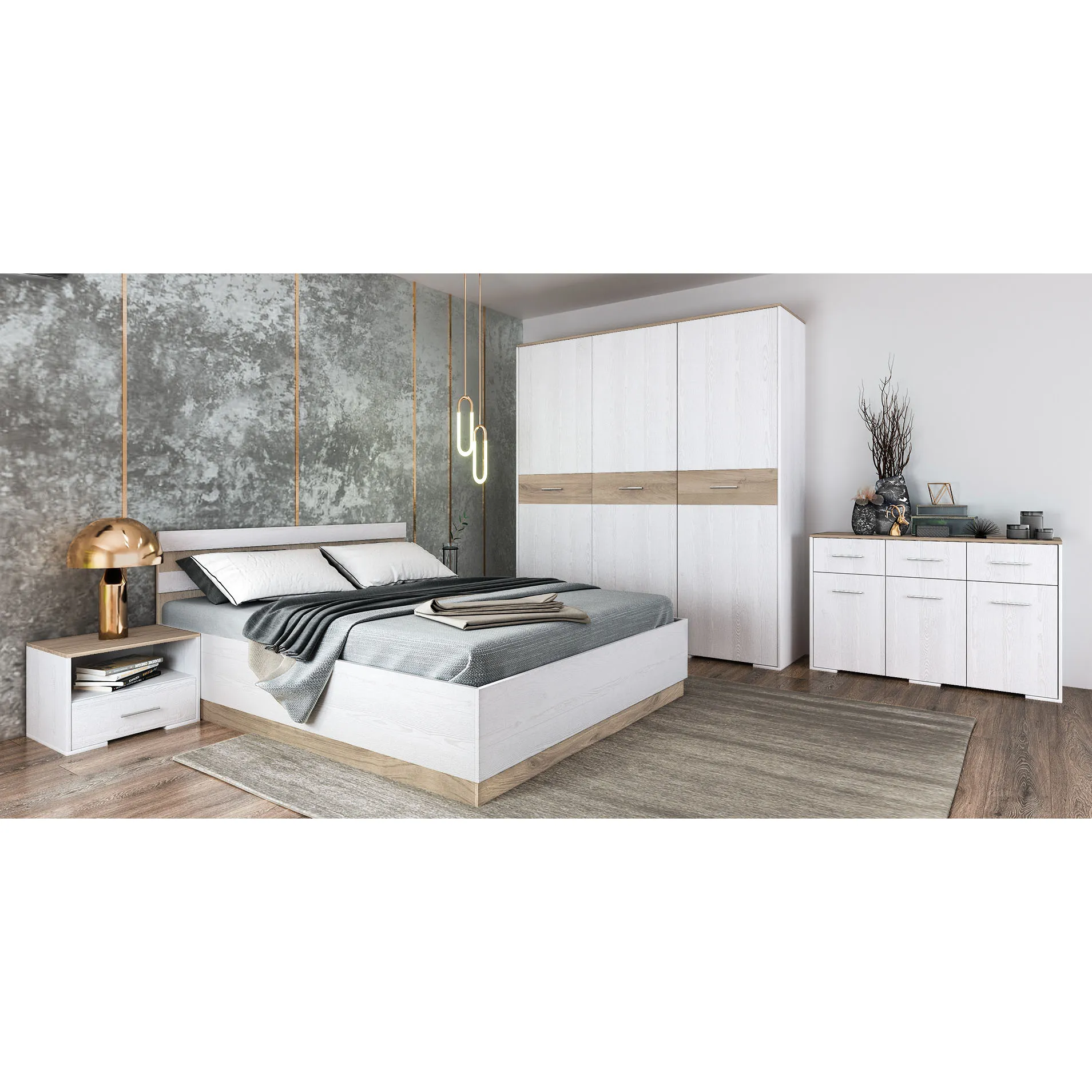 Dormitor Irim Elif, Pat 160x200 cm, Dulap 3 usi, 2 Noptiere, Comoda, Culoare Alb stilizat/Sonoma