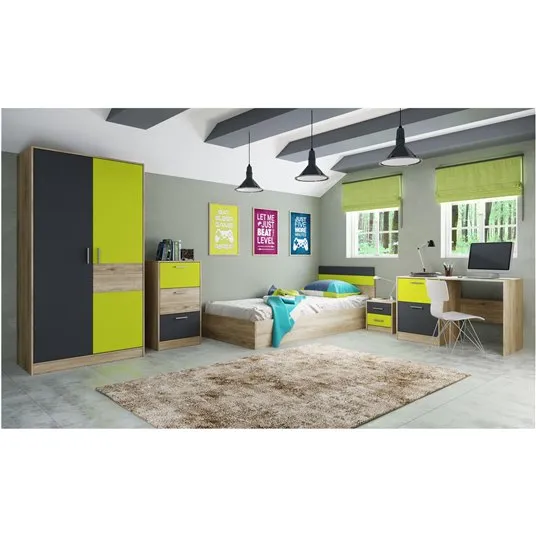 Dormitor tineret Irim Todor, Pat 90x200 cm, Dulap, Birou, comoda, Culoare Lime/Negru