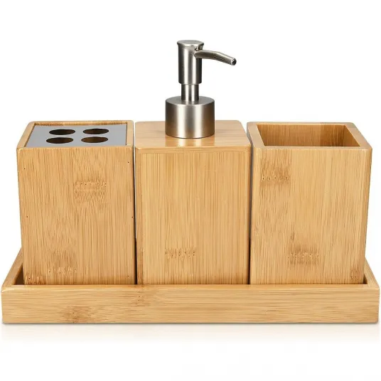 Dozator sapun lichid cu 2 suporturi Navaris, din bambus, natur, 25 x 10.5 x 18.5 cm