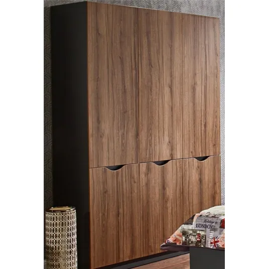 Dulap Ambianta Happy 2100x1500x520 Nuc se mandreste cu un design elegant si modern, perfect pentru orice casa contemporana. Exteriorul dulapului este finisat intr-o culoare calda nuc, dandu-i o textura naturala a lemnului care completeaza orice decor. Dulapul are doua usi glisante, care faciliteaza accesul la haine si la alte articole. Manerele usilor sunt realizate din metal de inalta calitate, oferind dulapului un aspect elegant si modern.