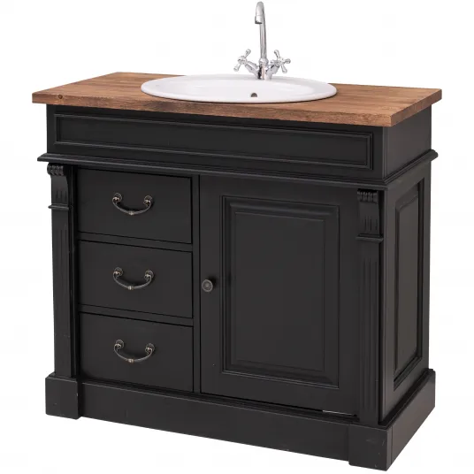 Dulap baie ornamentat pentru lavoar cu 3 sertare si 1 usa, vopsit, culoare negru, top maro, 100% lemn masiv, 103x51x91 cm