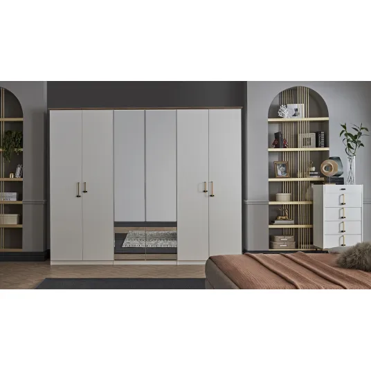 Dimensiuni: Latime: 267,6 cm Adancime: 59,4 cm Inaltime: 220,1 cm Articol: 3200383329. Colectia: Larina Culoare: Alb / Natur Material: Pal / MDF / Metal / Sticla Cu acest mobilier extraordinar veti petrece momente speciale in confortul casei dumneavoatra. Mobilierul din colectia Larina imbina armonios designul modern cu utilitatea. Forma interesanta in combinatie cu liniile geometrice vor crea o atmosfera relaxanta. Dulapul Larina se integreaza perfect in locuinta dumneavoastra si creeaza un puternic efect vizual. Detalii tehnice: Produsul este realizat din pal si MDF. Respecta toate standardele de calitate ale UE. Articol: 3200383329