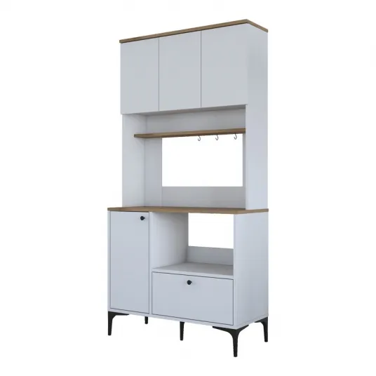 Dulapul Bender dispune de patru compartimente spatioase si un sertar practic, ideale pentru depozitarea alimentelor, ustensilelor sau a micilor electrocasnice. In plus, zona deschisa de rafturi este perfecta pentru amplasarea cuptorului cu microunde si a aparatului de cafea, creand astfel o statie de cafea si mic dejun extrem de convenabila.