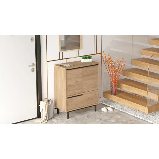 Realizat din panouri de particule acoperite cu 100% melamina, dulapul nostru de pantofi este construit pentru a dura. Grosimea de 18 mm asigura robustetea si durabilitatea, ceea ce il face o solutie de depozitare fiabila pentru multi ani de acum incolo. Culoarea de nuc adauga o nota calda si primitoare, imbinandu-se perfect cu orice decor.