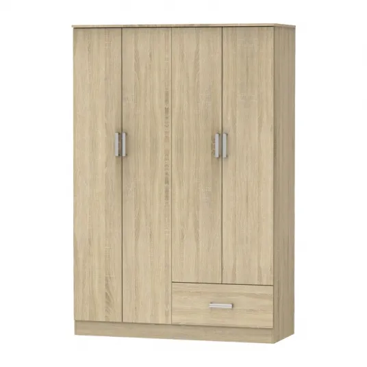 Dulapul Karter este construit din lemn PAL, un material compus din mici bucati de lemn, care ofera rezistenta la stres si uzura. Acesta este realizat din materiale reciclate, fiind o alegere ecologica. Dulapul dispune de patru usi, dintre care doua sunt dotate cu un sina pentru umerase, iar celelalte doua au patru rafturi interioare. La baza dulapului se afla un sertar glisant, ideal pentru depozitarea hainelor si accesoriilor.