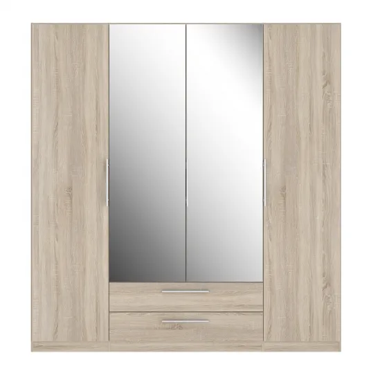 Acest dulap mare, cu patru usi, in decorul stejarului Sonoma este echipat cu sase rafturi, doua bare de umerase si doua sertare incapatoare, ceea ce permite utilizarea optima a spatiului. Designul si culoarea neutra permit utilizarea sa in diferite camere ale casei sau apartamentului. Manerele subtiri, verticale, in culoare argintie, vor adauga eleganta. Oglinzile mari, montate pe usile centrale, vor conferi adancime si vor mari optic interiorul, facilitand selectia hainelor de zi cu zi. Sarcina maxima a raftului este de 5 pana la 10 kg. Sarcina maxima a barei de haine este de 15 kg. Sarcina maxima a sertarului este de 3 kg. Este prevazut cu cant ABS rezistent la daune. Montarea pe perete este necesara (feronerie inclusa). Suprafata usor de curatat.