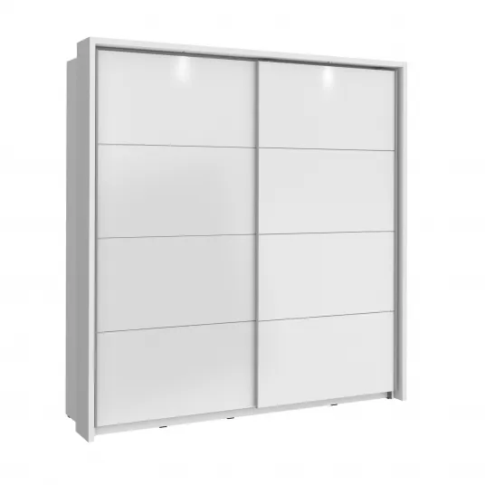 Un dulap modern, elegant, in decorul alb lucios este solutia perfecta pentru camera unui adolescent sau dormitor. Interiorul sau proiectat functional asigura suficient spatiu de depozitare.  Ledurile pe care rama le include garanteaza aspectul deosebit al dulapului, creand o atmosfera de neegalat in camera. Rafturile sunt adanci si incapatoare, iar bara de umerase ofera suficient spatiu pentru depozitarea hainelor. Usile culisante sunt o solutie excelenta, in special pe holurile inguste. Dotat cu cant ABS durabil, rezistent la deteriorare. Manerele din metal, in nuanta aluminiului, subliniaza designul modern al produsului. Sarcina maxima a barei de umerase este de 15 kg. Dulapul este confectionat din PAL de inalta calitate.