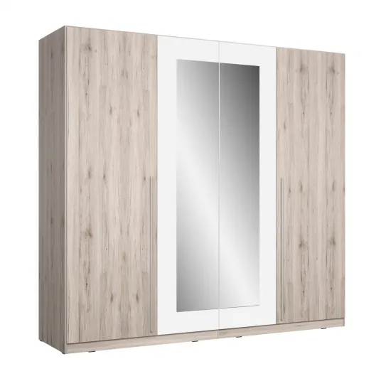 Dulapul cu patru usi in decorul stejar nisipiu cu alb se va incadra cu usurinta in multe camere cu design diferit. Este impartit in doua compartimente separate - unul prevazut cu bara de umerase si raft superior si al doilea cu patru rafturi pentru hainele pliate. Manerele longitudinale din plastic in culoarea aluminiului reprezinta decoratiuni subtile ale acestui dulap. Oglinda are rolul de a mari optic orice camera. Sarcina maxima a barei de umerase este de 15 kg. Sarcina maxima a raftului este de 5 kg. Suprafata usor de curatat. Montarea pe perete este necesara (feronerie inclusa).