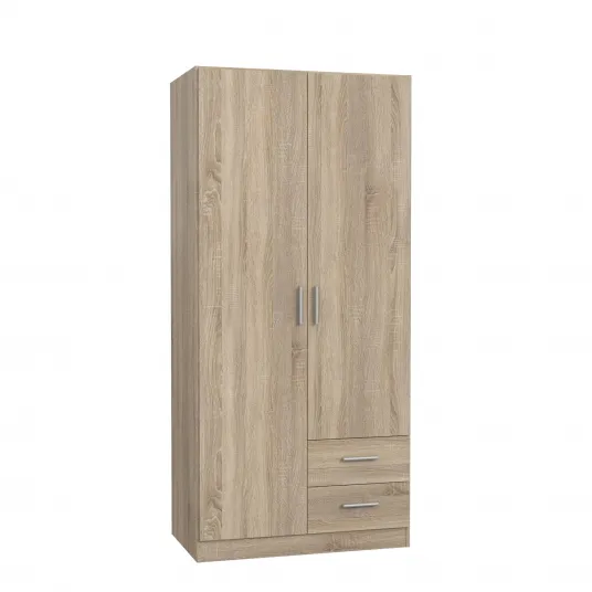 Datorita formei simple si functionalitatii sale, acest dulap cu doua usi, in decorul stejarului Sonom,a se va incadra cu usurinta in multe camere amenajate in stiluri diferite. In interiorul dulapului se afla patru rafturi practice pentru plasarea lucrurilor pliate si o bara de umerase pentru agatarea hainelor. In partea inferioara este prevazut cu doua sertare spatioase, unde se poate depozita, de exemplu, lenjerie. Dulapul are manere din plastic, alungite, in culoarea aluminiului. Sarcina maxima a barei de umerase este de 15 kg. Sarcina maxima a rafturilor este de 5 kg. Sarcina maxima a sertarului este de 3 kg. Montarea pe perete este necesara (feronerie inclusa).