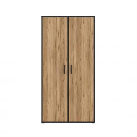 Dulapul cu 2 usi din colectia Mokkaro este perfect pentru interioarele amenajate in stil industrial, in special in camere precum biroul de acasa. Dispune de spatiu bine organizat, cu bara de umerase si 5 rafturi. Cu aceasta structura, garderoba va permite sa stocati diverse articole, nu numai imbracaminte, ci si documente sau echipamente electronice. Dulapul functional are dimensiunile: latime 94,7 cm x inaltime 190,5 cm x adancime 52,7 cm, asigurand un spatiu de depozitare optim. Decorul combina negrul cu stejarul Catania. Stabilitatea acestei piese de mobilier este asigurata prin montarea pe perete (set complet de feronerie inclus).