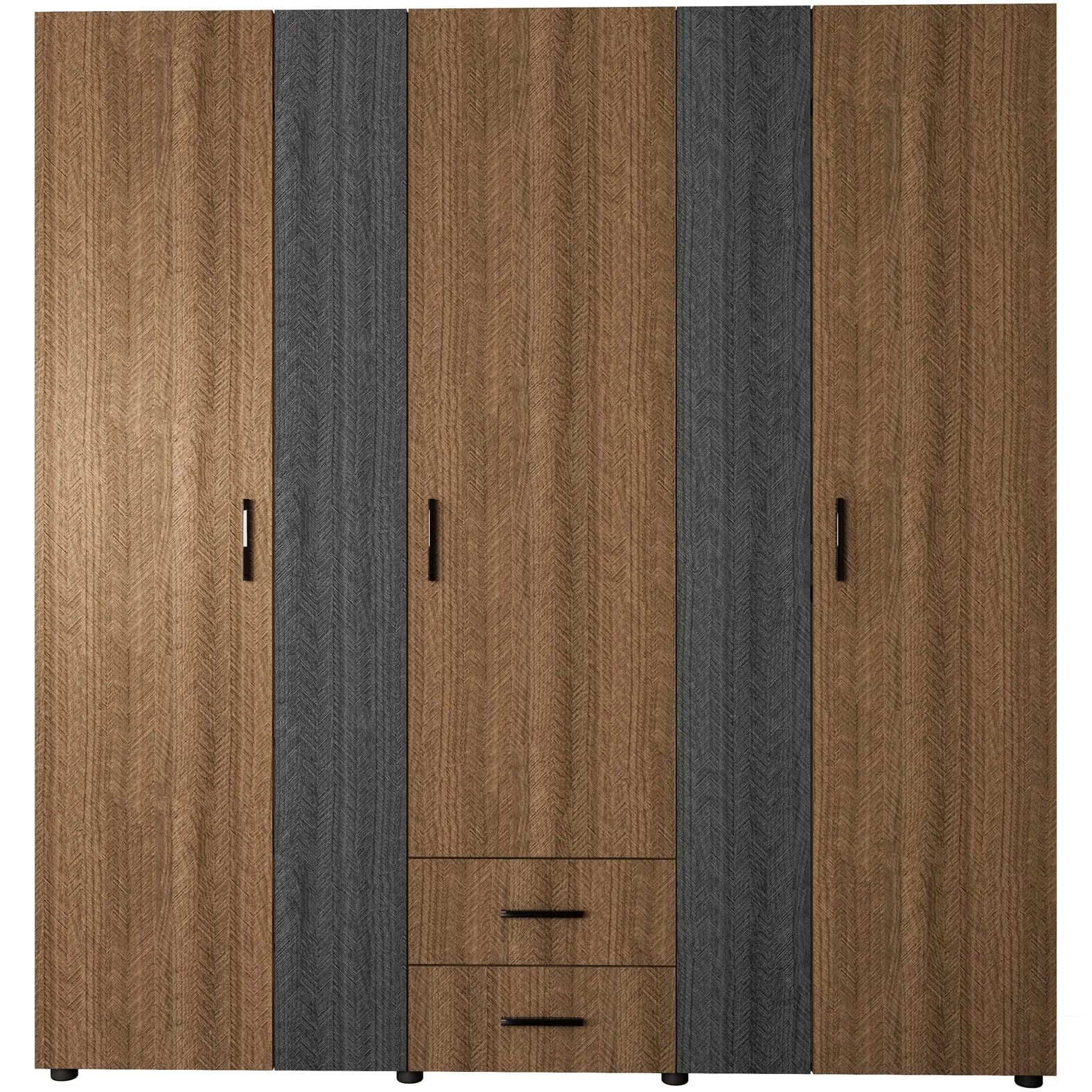 Dulap irim Aston 190 x 52 x 202 cm. Dulap cu 5 usi, 2 sertare, 8 rafturi si 3 spatii cu bara de umerase. Constructie cu PAL de 16 mm, cant ABS, balamale soft close. Include iluminare LED.