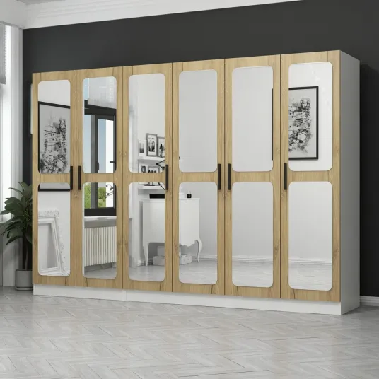 Cu dimensiunile sale generoase de 225 cm in latime, 210 cm in inaltime si 52 cm in adancime, acest dulap ofera un spatiu de depozitare abundent pentru toate hainele, accesoriile si multe altele. Numeroasele rafturi ofera optiuni de organizare convenabile, permitandu-va sa va pastrati bunurile ordonate si usor accesibile.