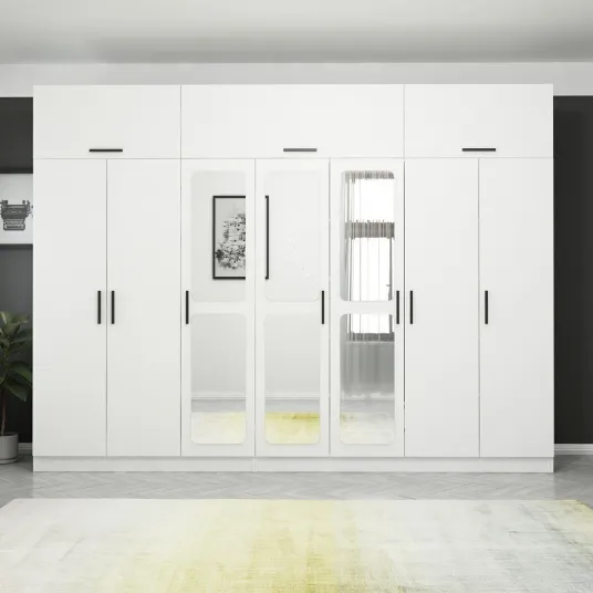 Cu o latime de 315 cm, o inaltime de 255 cm si o adancime de 52 cm, acest garderoba ofera un spatiu de depozitare suficient pentru toate imbracamintea si accesoriile dvs. Numeroasele rafturi ofera mult spatiu pentru a mentine totul ingrijit si ordonat, in timp ce optiunea de a -l repara pe perete asigura stabilitatea si siguranta.