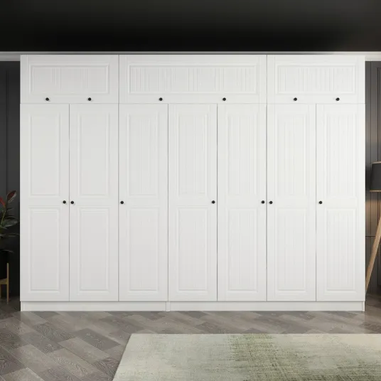 Cu o latime de 315 cm, o inaltime de 235 cm si o adancime de 52 cm, acest garderoba ofera un spatiu de depozitare suficient pentru toate imbracamintea si accesoriile dvs. Numeroasele rafturi ofera mult spatiu pentru organizarea bunurilor dvs., in timp ce optiunea de a -l repara pe perete asigura stabilitatea si siguranta.
