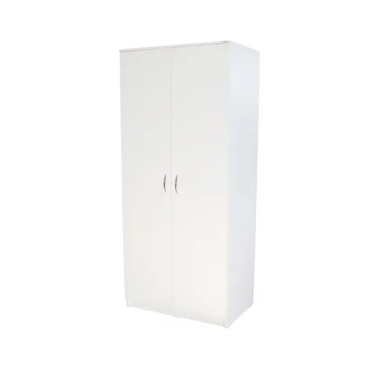 Dulap Soft cu 2 usi fabricat din PAL Melaminat cu grosimea de 16 mm alb, manere din plastic cu filet metalic, 2 spatii de depozitare cu polite si 1 spatiu cu bara de haine pentru umerase, picioruse din plastic cu rol impotriva zgarierii pardoselilor. Latime: 80 cm , Inaltime: 180 cm , Adancime: 53 cm.