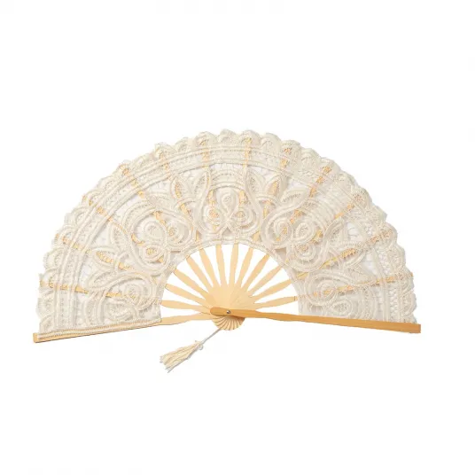 Evantai dantele, NUODWELL, Lungime inchisa 27 cm, deschidere 54 cm, Designul pliabil, Greutate redusa, Usor de transportat, Reutilizabile, Pentru decoratiuni interioare, nunti si concerte, Bumbac/Bambus, Bej
