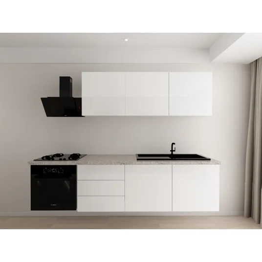 Lungimea totala a bucatariei Evora 1 este de 2.4 metri, aceasta dimensiune asigurand o integrare armonioasa si eficienta in orice spatiu dedicat, fie ca este vorba de o bucatarie spatioasa sau una mai compacta.