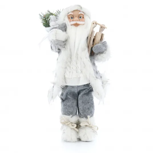 Figurina Mos Craciun Kring, cu sanie si sac de cadouri, 46 cm, Gri/Alb