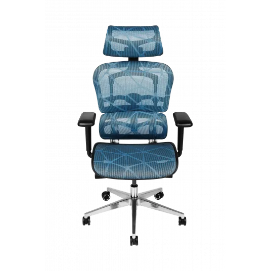 Fotoliu pentru oficiu, rotativ, sezut din plasa elastomerica, spatar din plasa elastomerica, reglare inaltime spatar, sezut reglabil inainte/inapoi, suport lombar reglabil, tetiera reglabila 3D, cotiere reglabile 3D, roti din poliuretan, albastru
