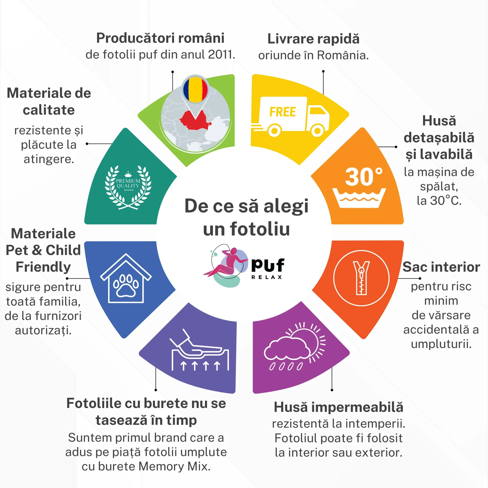 Fotoliile Puf umplute cu granule de polistiren sunt comode, dar cele umplute cu burete Memory Mix sunt next level! Ne mandrim cu faptul ca suntem pionieri in aducerea pe piata din Romania a fotoliilor umplute cu burete Memory Mix, redefinind conceptul de confort si inovatie. Cand existau doar fotolii clasice cu perle de polistiren, noi am adus romanilor acea senzatie magica de a te scufunda intr-un norisor de puf. Cu o garantie de 6 ani, fotoliul PLAYER isi pastreaza forma initiala, nu se taseaza, nefiind nevoie de reumplere, spre deosebire de fotoliile cu granule.