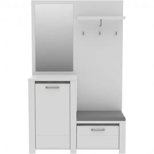 Acest set pentru mobilarea holului va fi locul perfect pentru depozitarea hainelor, incaltamintei si a altor accesorii necesare. Produsul include un panou pentru haine cu un sezut tapitat confortabil, un pantofar si o oglinda mare si transparenta. Decorul subtil de alb lucios, combinat cu elemente contrastante in decorul betonului gri inchis, va adauga farmec si eleganta camerei.