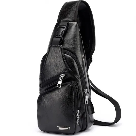 Geanta de umar, de piept sau de mana, Aucuu®, piele PU, cu port USB extern si orificiu pentru casti, negru, 34x16x10 cm