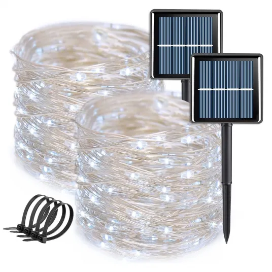 Ghirlanda luminoasa cu leduri, Darklove, Cu cravata din nailon, 2 buc, 8 moduri, Panou solar, 100 becuri filament LED, Ip65 wateproof, Durabile, Pentru gradinii si curtii, Cupru, 12m, Alb rece
