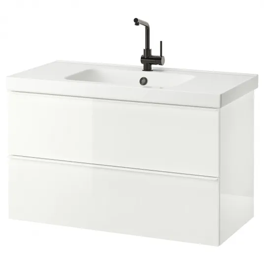 IKEA GODMORGON / ODENSVIK Masca lavoar cu 2 sertare, lucios alb/baterie LUNDSKAR, 103x49x64 cm