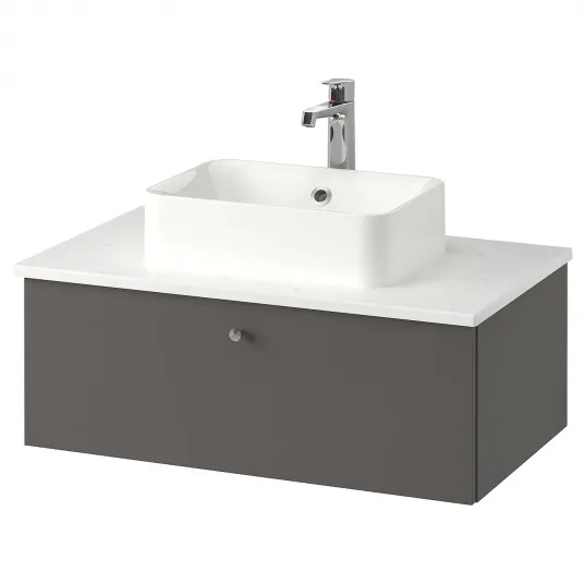 IKEA GODMORGON/TOLKEN / HORVIK Suport lavoar+blat 45x45 lavoar, Gillburen gri inchis/aspect marmura baterie Brogrund, 82x49x43 cm