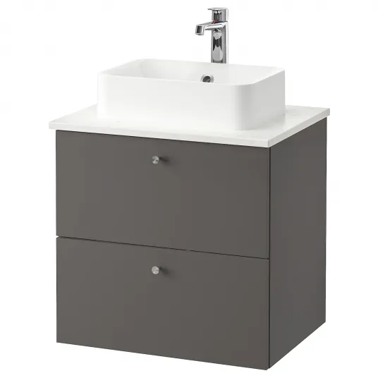 IKEA GODMORGON/TOLKEN / HORVIK Suport lavoar+blat 45x45 lavoar, Gillburen gri inchis/aspect marmura baterie Brogrund, 62x49x72 cm
