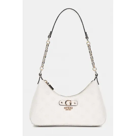 GUESS, Geanta din piele ecologica cu bareta de umar din lant Gerty, Alb murdar