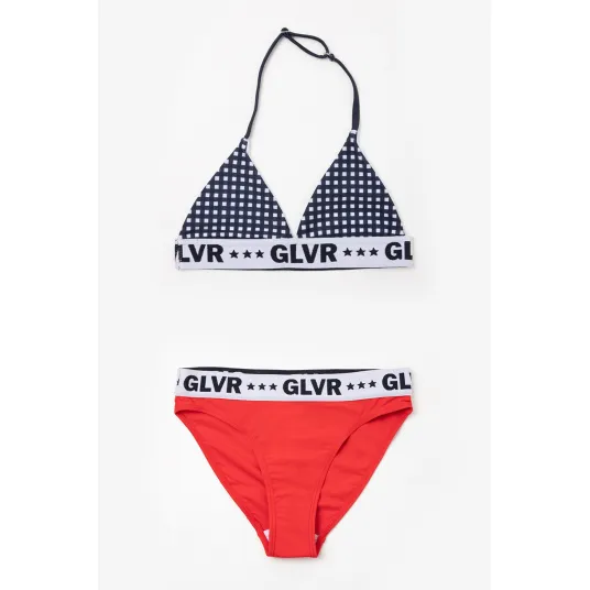 GULLIVER, Costum de baie din doua piese cu model in carouri, Alb, Corai, Bleumarin, 146-152 CM