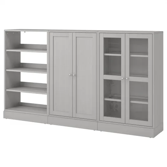 - Cu spatiu amplu de depozitare si multiple optiuni de depozitare, IKEA HAVSTA ansamblu depozitare+usi sticla gri 243x37x134 cm este o alegere excelenta pentru optimizarea spatiului din casa ta.