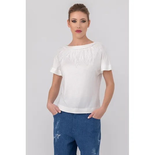 HELENE GALWAS, Tricou cu aplicatii cu pene Alexandra, Alb optic, L