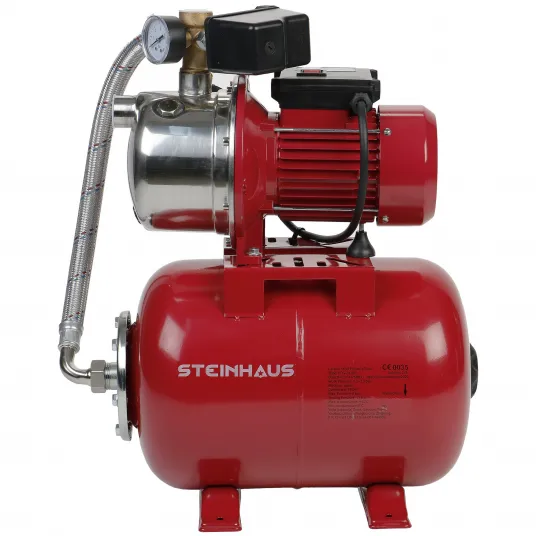 Hidroforul Steinhaus PRO-BOO24l cu carcasa pompei din inox si vas de expansiune de 24 litri, membrana EPDM, comutator de presiune, manometru pentru verificarea presiunii si furtun flexibil antivibrant.