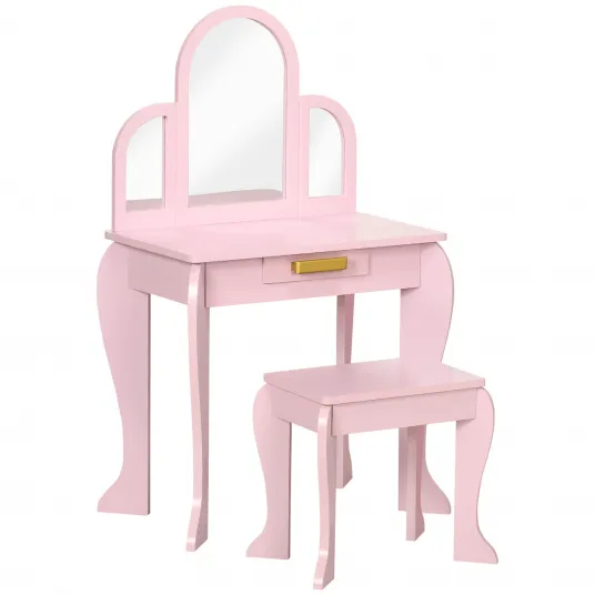 HOMCOM Masa cu oglinda si taburet, set de vanitate pentru copii, birou de machiaj pentru fete cu sertar pentru copii de 3-6 ani, roz