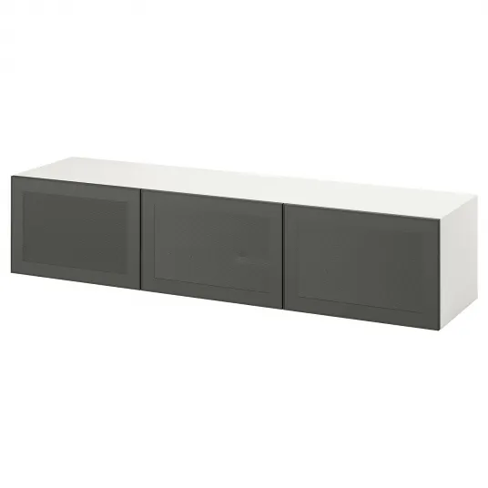 IKEA BESTÅ Comoda TV+usi, alb/Mörtviken gri inchis, 180x42x38 cmPolite reglabile; adapteaza spatiul nevoilor tale., Este usor sa ascunzi cablurile de la TV si alte dispozitive, dar sa ramana la indemana; comoda TV are orificii pentru cabluri in spate., Poti opta pentru functia de inchidere lenta sau de deschidere prin apasare. Functia de deschidere prin apasare iti permite sa deschizi usile cu o atingere usoara, iar balamalele pentru inchidere lenta asigura o inchidere silentioasa si lina., Orificiul pentru cabluri din partea superioara permite accesul cablurilor catre comoda TV., Poti plasa echipamentul electronic in spatele usilor din plasa metalica deoarece permit transmiterea semnalului prin telecomanda., O comoda TV montata pe perete creeaza un aspect simplu si aerisit si este mai usor sa aspiri podeaua., Optimizeaza si organizeaza depozitarea BESTÅ cu cutii si accesorii care iti plac., Foloseste o comoda TV mai lata decat televizorul. Aceasta comoda este potrivita pentru un televizor cu diagonala maxima 72 inchi. Poti alege un televizor mai mare daca nu este mai greu decat sarcina maxima specificata pentru partea superioara a comodei., Panoul superior al comodei TV este potrivit pentru un televizor cu greutatea maxima de 50 kg., Incarcatura maxima suportata de comoda TV suspendata depinde de materialul din care este facut peretele., Peretii sunt construiti din materiale diferite si, de aceea, necesita diferite tipuri de dispozitive de fixare. Foloseste-le pe cele potrivite pentru peretii casei tale (se vand separat)., Daca nu esti sigur ce tip de accesorii sa folosesti, contacteaza magazinul de produse de feronerie., Include: maner.223163864223163864
