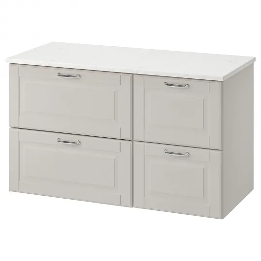 Va prezentam unitatea de lavabou IKEA GODMORGON TOLKEN cu 4 sertare. Aceasta piesa de mobilier eleganta si functionala este conceputa pentru a va imbunatati spatiul de baie, oferind in acelasi timp optiuni ample de depozitare. Cu aspectul sau de marmura gri KasjOn si designul elegant, adauga o nota de sofisticare moderna oricarui decor de baie.