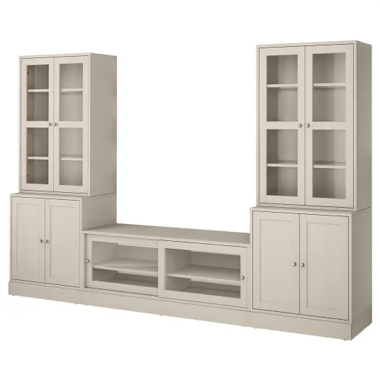 IKEA HAVSTA Ansamblu depozitare TV/usi sticla, gri-bej, 322x47x212 cmDesignul scandinav cu linii simple al dulapului este usor de combinat cu mobilier in stiluri diferite., Usile din sticla iti permit sa pastrezi obiectele pretioase departe de praf, dar la vedere., Foloseste o comoda TV mai lata decat televizorul. Aceasta comoda este potrivita pentru un televizor cu diagonala maxima 63 inchi. Poti alege un televizor mai mare daca nu este mai greu decat sarcina maxima specificata pentru partea superioara a comodei., Panoul superior al comodei TV este potrivit pentru un televizor cu greutatea maxima de 30 kg., Peretii sunt construiti din materiale diferite si, de aceea, necesita diferite tipuri de dispozitive de fixare. Foloseste-le pe cele potrivite pentru peretii casei tale (se vand separat)., Pentru asamblarea acestui articol de mobilier sunt necesare 2 persoane., Combina cu alte produse din familia HAVSTA.223164147223164147