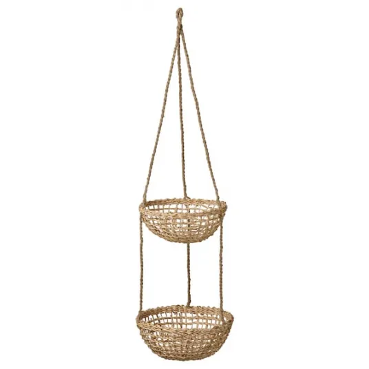 Aceste 2 cosuri suspendate sunt ideale pentru a depozita diverse lucruri, perii de par, manusi si chei - simple, decorative si pastreaza lucrurile la indemana., Cosurile sunt impletite din fibre de bananier si sunt agatate de o franghie din iuta - doua materiale naturale durabile care creeaza un aspect natural si rustic., Fiecare cos este unic datorita variatiilor naturale de culori ale fibrelor de bananier., Acest produs este lucrat de intreprinderea sociala Industree PT din India care, prin productia sa bazata pe fibre naturale, ajuta femeile sa isi castige existenta folosindu-si abilitatile artizanale.