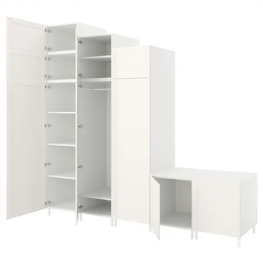 Va prezentam Dulapul IKEA PLATSA cu 9 usi in finisaj alb Sannidal alb. Acest dulap spatios ofera spatiu amplu de depozitare cu cele noua usi si designul elegant. Cu dimensiunile de 300x57x271 cm, ofera un spatiu generos pentru a va pastra organizate hainele, accesoriile si lucrurile.