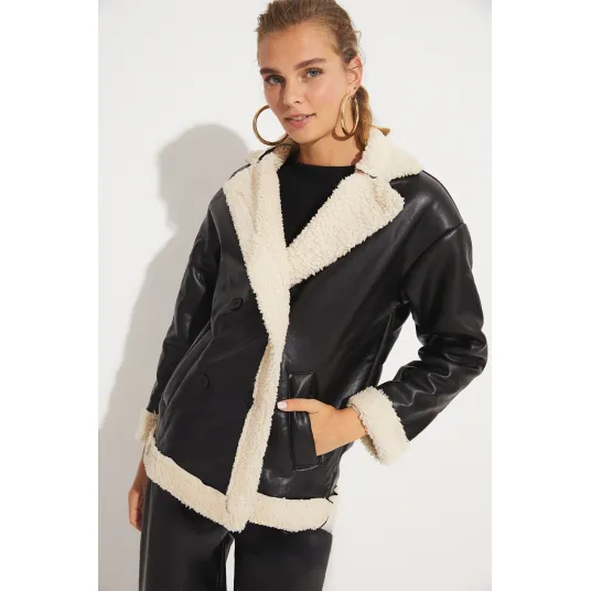 June, Palton din piele ecologica cu garnituri din blana shearling sintetica, Negru, 38June, Palton din piele ecologica cu garnituri din blana shearling sintetica, Negru, 38223753667223753667