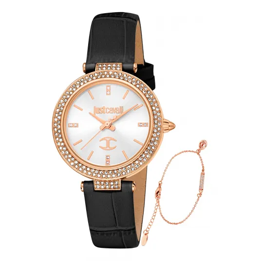 JUST CAVALLI, Set de ceas din otel inoxidabil si bratara, Negru