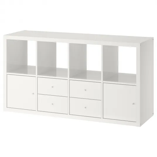 Te-ai saturat ca biroul tau de acasa sa para aglomerat si dezorganizat? Doriti o solutie simpla si eleganta pentru a va depozita lucrurile? IKEA KALLAX Etajera cu 4 organizatoare lucios/alb 77x147 cm este solutia suprema de depozitare pentru orice spatiu!