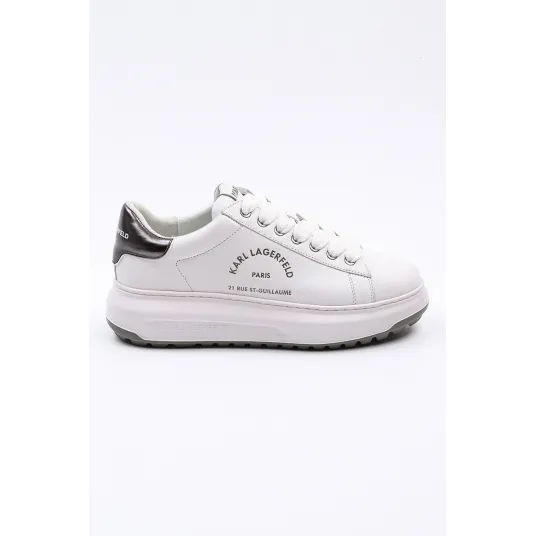 Karl Lagerfeld, Pantofi sport cu garnitura din piele ecologica si detalii logo, Alb, Argintiu inchis, 44