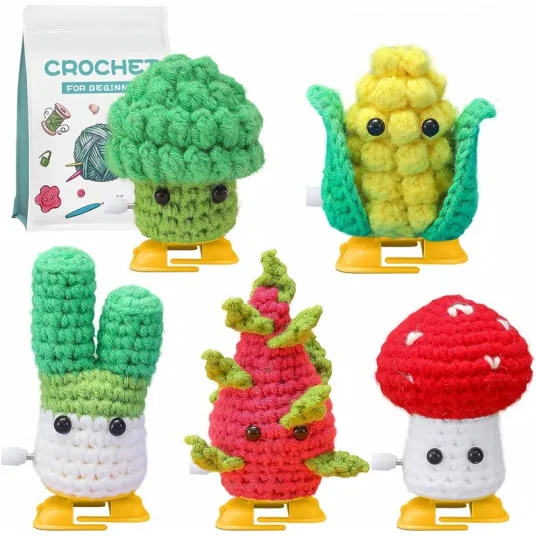 Kit de crosetat pentru incepatori, 5 buc Legume Haioase, cu Tutoriale Video, Amigurumi, multicolor