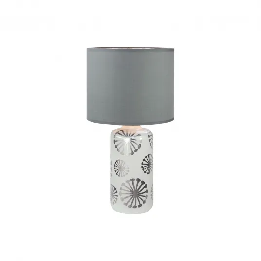 Lampa de masa Ginger cu o baza de sticla ceramica si abajur din material textil traditional va aduce un plus binevenit casei tale. Baza sa masiva, cu o forma caracteristica, este decorata cu un model argintiu care seamana cu flori de papadie de diferite dimensiuni. Lampa Ginger va fi un plus proaspat in livingul tau modern daca, de exemplu, o vei pune pe masuta de cafea. Lampa Ginger se potriveste unui bec cu o putere de pana la 60 W si un soclu E27. Daca doriti sa creati o atmosfera confortabila, intima, utilizati un bec alb cald. - Clasament IP: IP20 - tip soclu: E27 - Tensiune aplicata: 230V, 50Hz