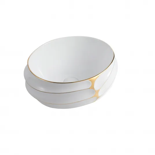 Deasupra tejghelei - Instalare Instalare usoara deasupra tejghelei, fara prea multe modificari ale dulapului de baie si blatului. Design nobil si elegant -- Aceasta chiuveta de arta pe blat are o forma ovala moderna si este decorata cu un model auriu care o face sa arate nobila si eleganta. Suprafata interioara este neteda si delicata, glazura este plina de luciu si textura. Chiuveta de arta Shiny Gold adauga o nota de lux usor si eleganta atemporala baii dumneavoastra si se potriveste perfect cu diferite stiluri de decorare a bailor.