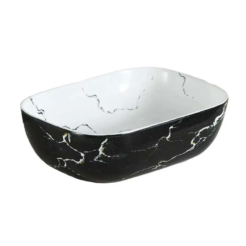 Lavoar, montaj pe blat, 46x33 cm, ceramica sanitara, Alb marble interior/Negru marble exterior, NicoliDesign sofisticat si unic: Contrastul dintre interiorul alb marble si exteriorul negru marble transforma lavoarul intr-o piesa centrala moderna si eleganta, potrivita pentru orice baie contemporana. Calitate superioara a materialului: Fabricat din ceramica sanitara de inalta densitate, lavoarul este rezistent la zgarieturi, usor de curatat si pastreaza un aspect impecabil pe termen lung. Intretinere simpla si eficienta: Suprafata neteda, non-poroasa si cu absorbtie scazuta a apei (<0,5%) previne acumularea de murdarie si mirosuri neplacute, economisind timp si energie la curatare.224299354224299354